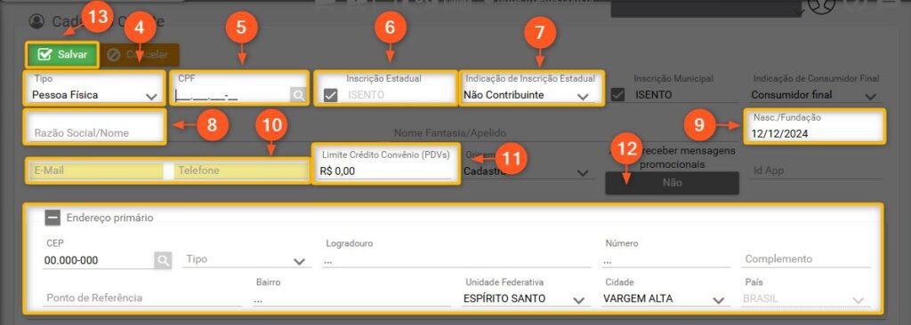 12 – Para fins fiscais é importante que você preencha todos os campos de ENDEREÇO do cliente.