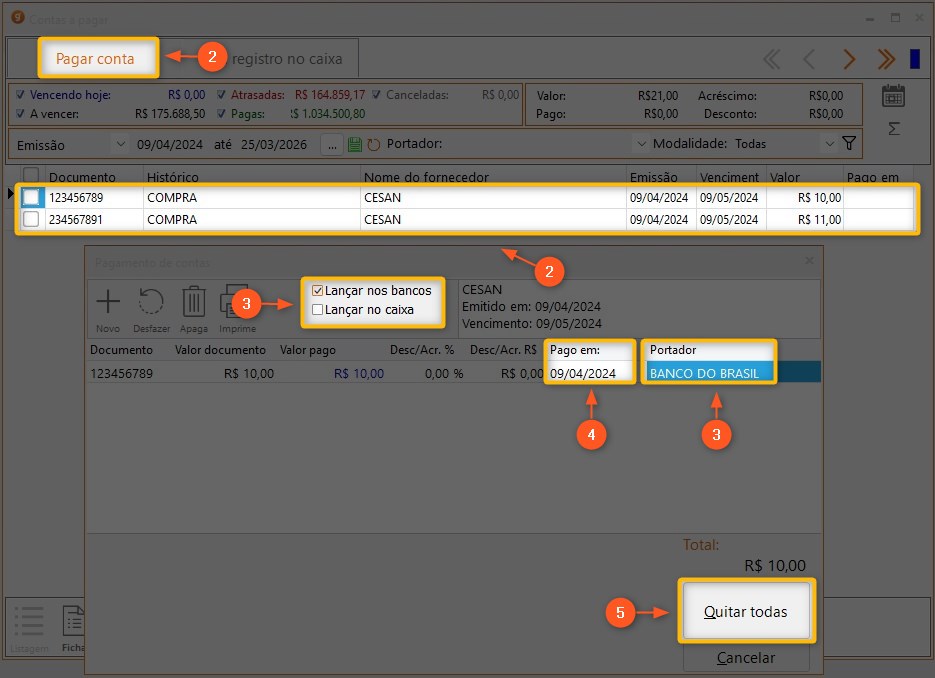 2 – Selecione a(s) parcela(s) que você deseja dar baixa (pagar) e clique em PAGAR CONTA no menu superior.