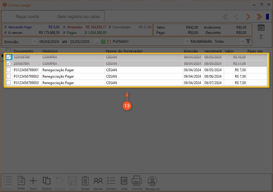 6 – Selecione todas as parcelas que deseja renegociar marcando o “quadradinho” no ínico de cada registro.
