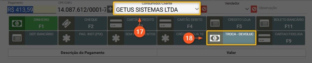 18 – Clique na forma de pagamento TROCA – DEVOLUÇÃO.