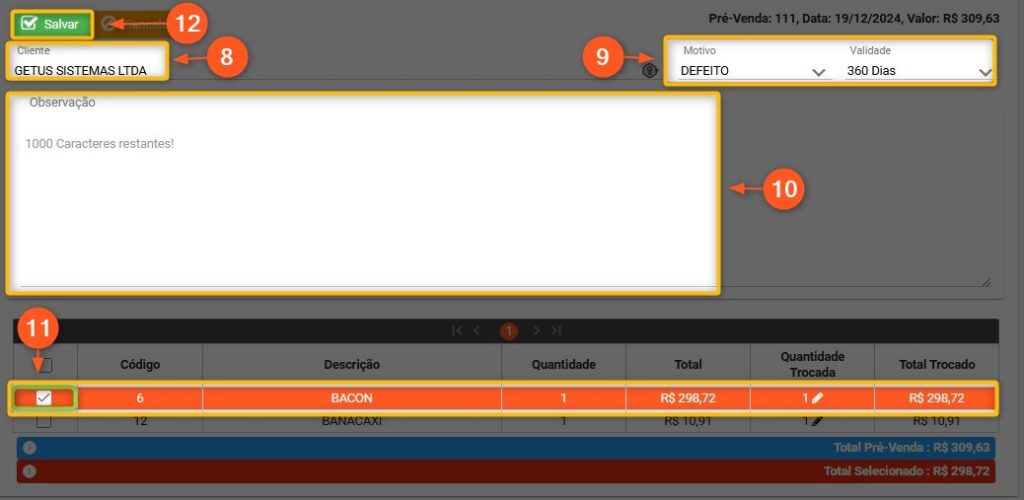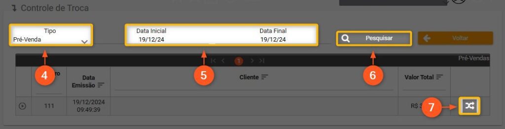 13 – Na listagem de TROCAS é possível verificar alguns dados da troca como o STATUS, VALIDADE, CLIENTE e entre outros.