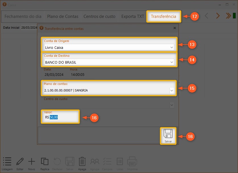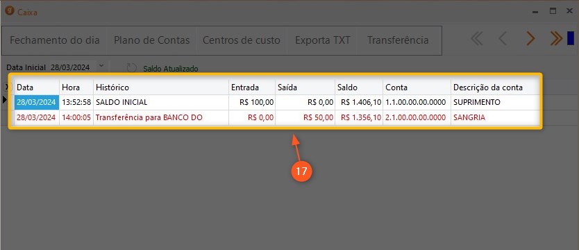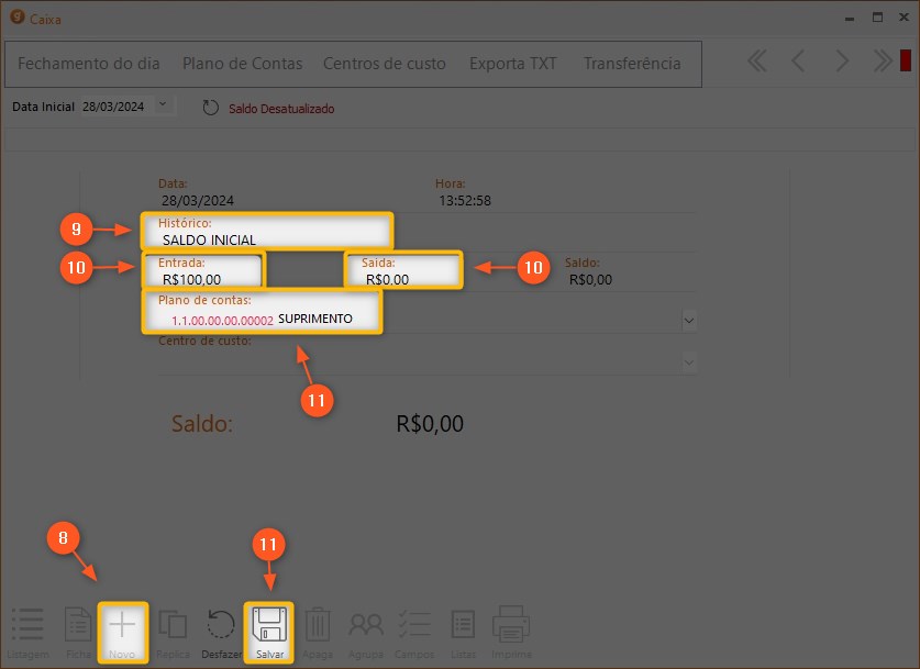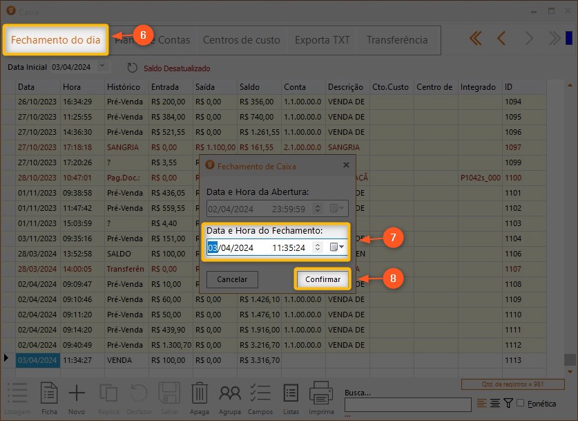 9 – Todos os lançamentos que são ANTERIORES a data de fechamento do caixa irão ficar da cor amarela, não sendo possível alterá-los e nem fazer lançamentos retroativos no caixa.