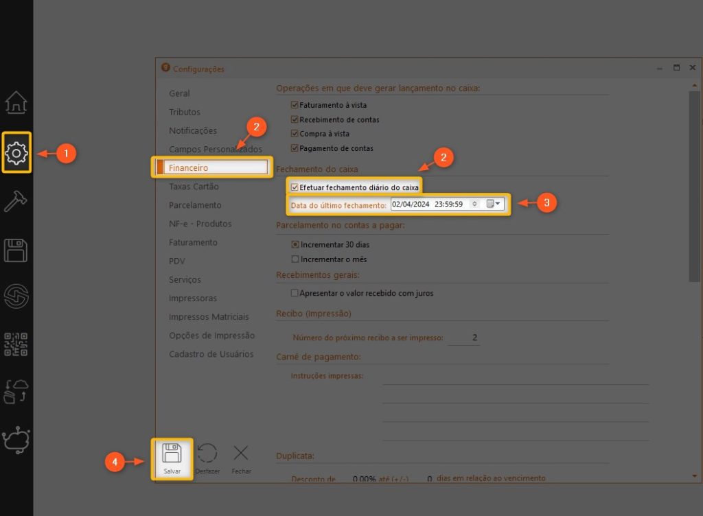 2 – Vamos em FINANCEIRO e marcamos a opção EFETUAR FECHAMENTO DIÁRIO DO CAIXA.
