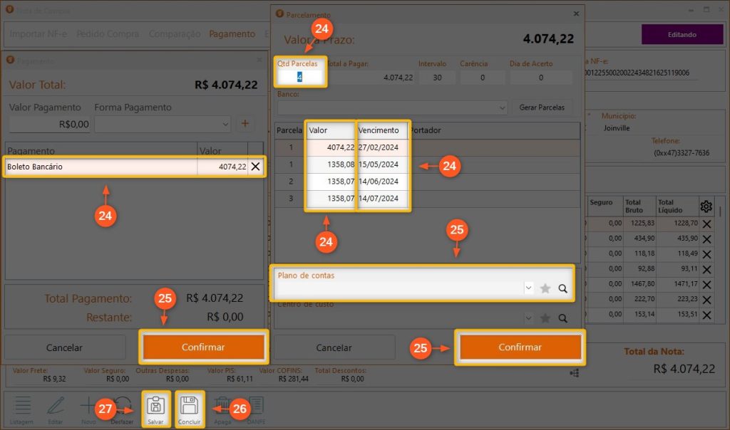Caso seja um pagamento a prazo, vai abrir outra tela para definição da quantidade de parcelas, valores e vencimentos.