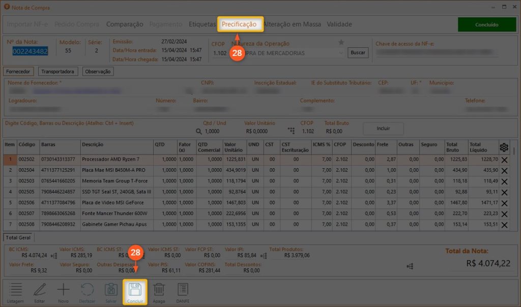 16 – Após CONCLUIR a nota clique em PRECIFICAÇÃO no menu superior.