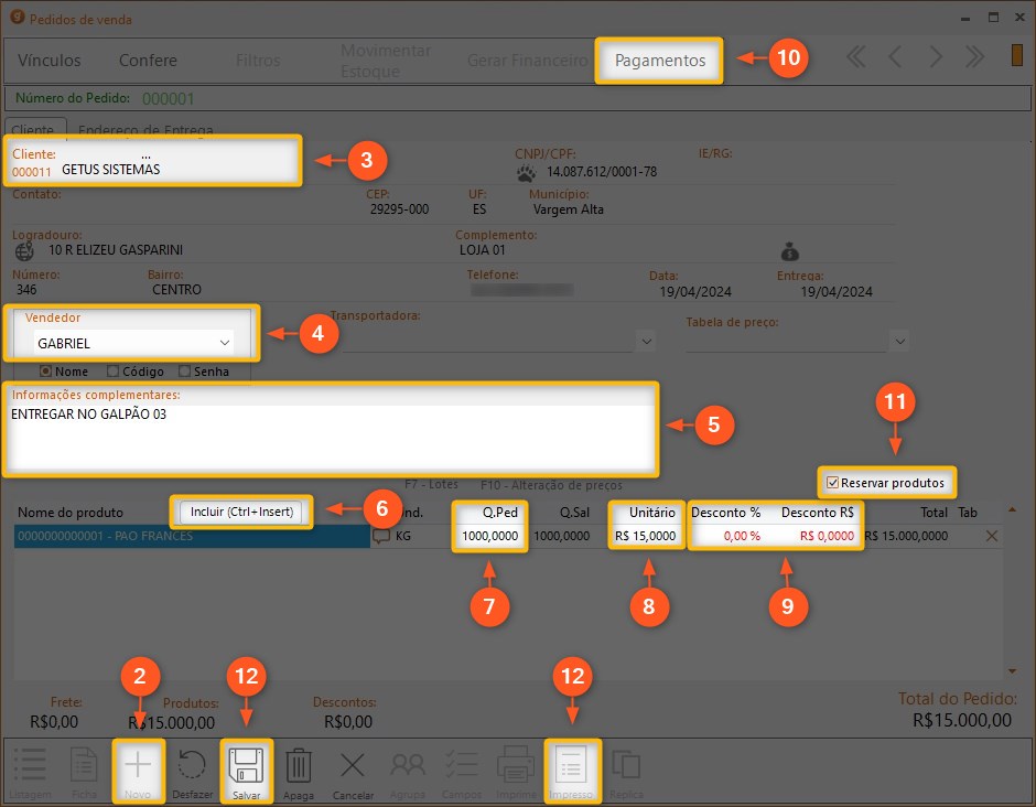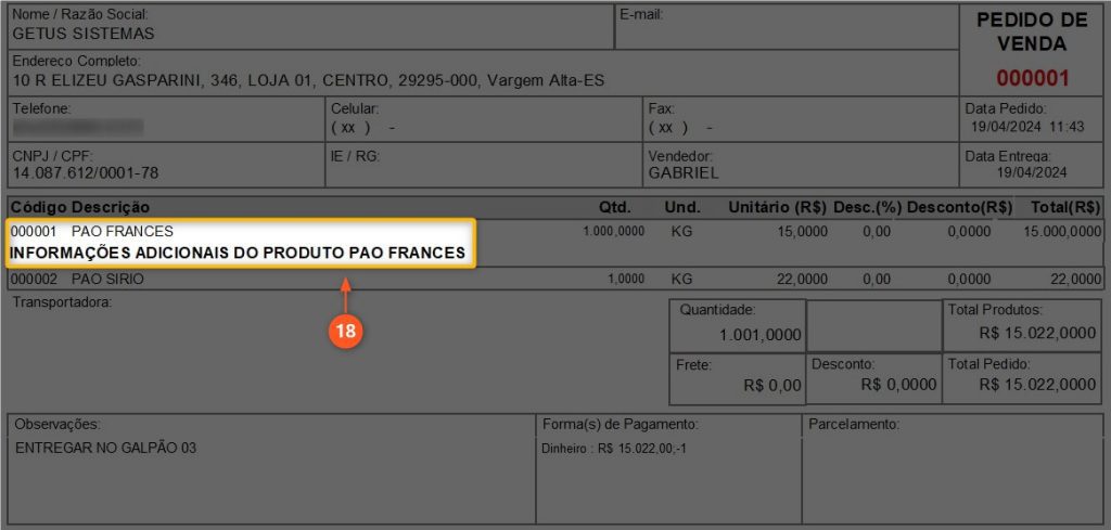 18 – Ao SALVAR o pedido e clicar em IMPRESSO, será exibido logo abaixo do nome dos produtos, as INFORMAÇÕES ADICIONAIS que você inseriu.