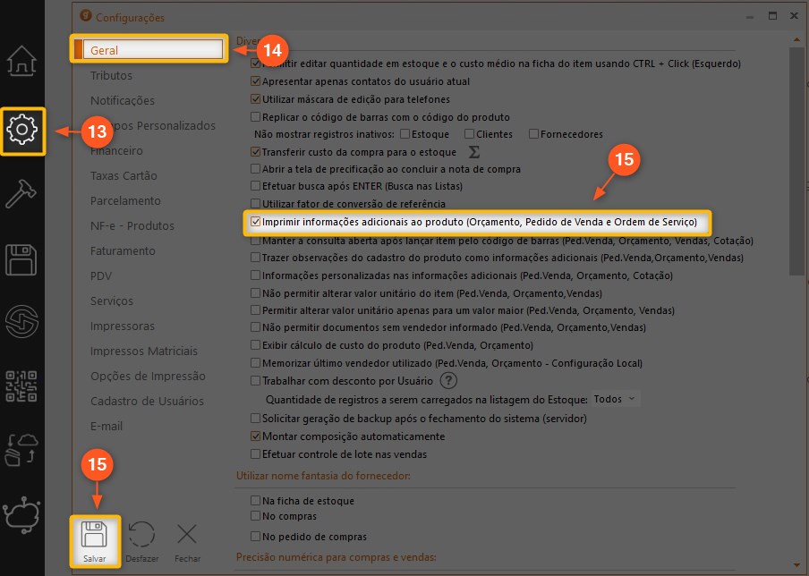 15 – Marque a opção IMPRIMIR INFORMAÇÕES ADICIONAIS AO PRODUTO (ORÇAMENTO E PEDIDO DE VENDA) e clique em SALVAR.