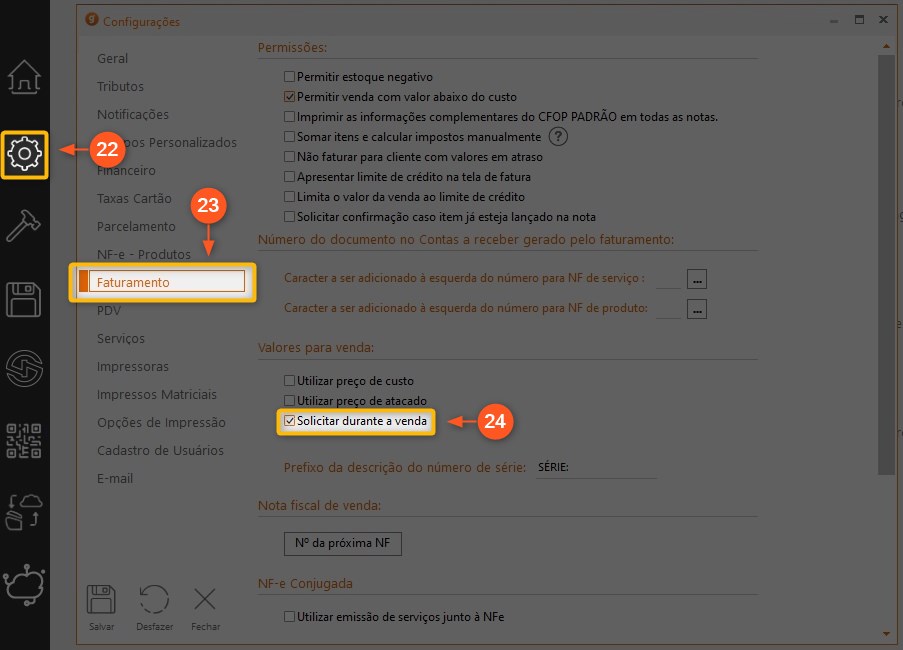22 – Para ativar essa opção acesse as configurações do sistema clicando na ENGRENAGEM no menu esquerdo.