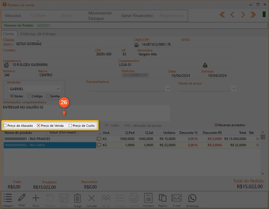 26 – Ficará disponível no pedido de venda as opções PREÇO DE ATACADO, PREÇO DE VENDA e PREÇO DE CUSTO.