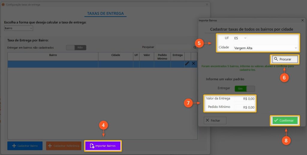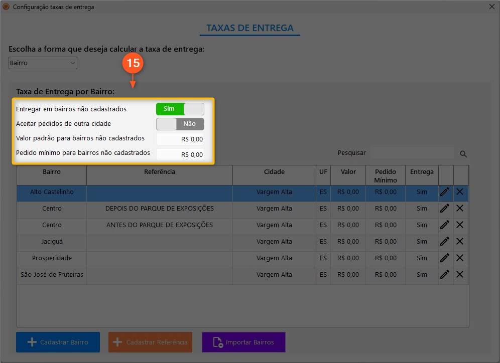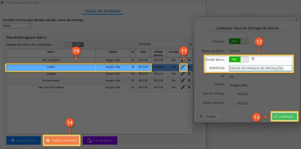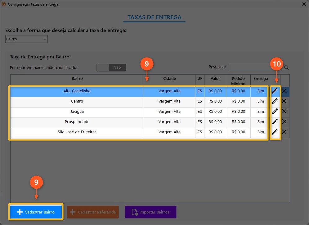 11 – Caso haja duas ou mais taxas de entrega para um mesmo bairro é possível dividi-lo. Para isso, edite o bairro desejado clicando no ícone de lápis no canto direito.