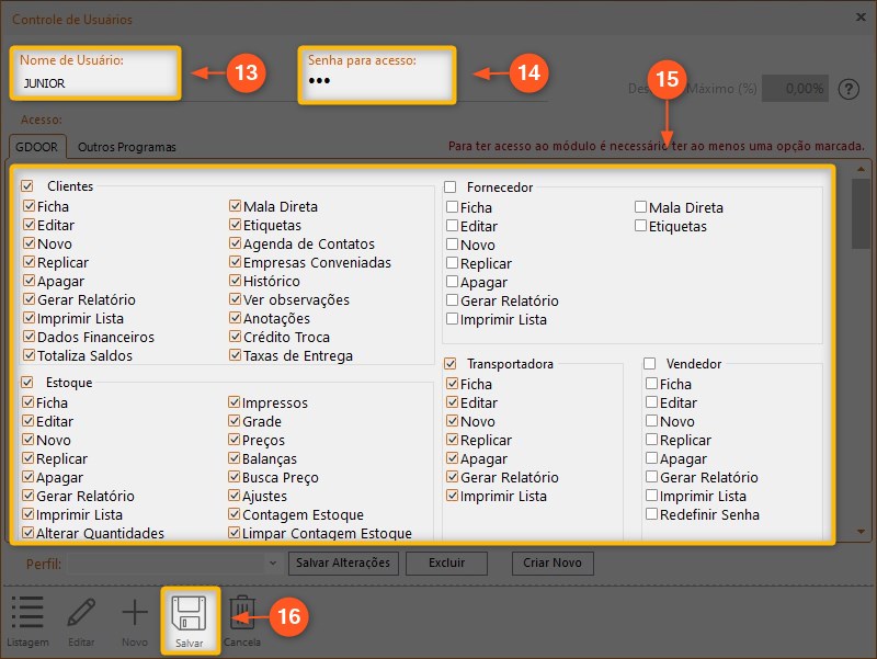 15 – Marque as opções que aquele perfil poderá ter acesso em cada módulo do sistema.