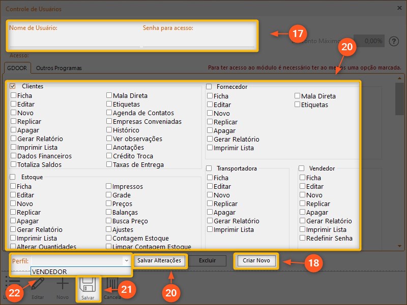 22 – Para os próximos cadastros que for fazer, basta selecionar o perfil VENDEDOR que você criou anteriormente e todas as opções que estão salvas nesse perfil serão marcadas automaticamente.