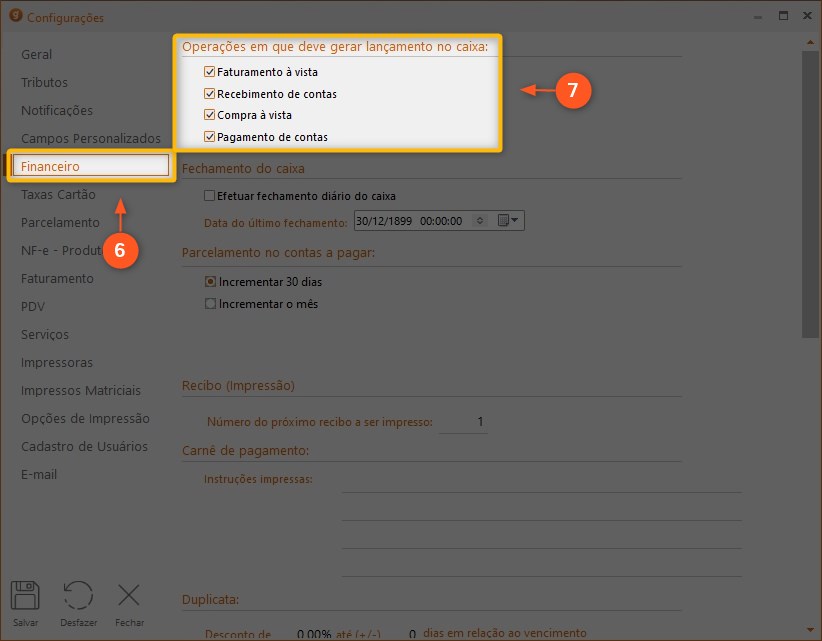 7 – Você pode definir as movimentações que irão gerar lançamentos em seu caixa, caso faça o controle financeiro no sistema.