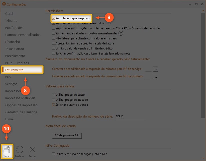 9 – Você pode definir se irá permitir que o estoque dos seus produtos possam ficar negativos ou não. Com essa opção ativa, será possível vender o produto mesmo que não haja quantidade em estoque.