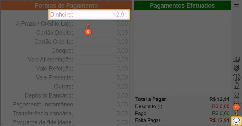 5 – Digite o valor pago na forma de pagamento utilizada pelo cliente e aperte ENTER. Você pode utilizar várias formas de pagamento ao mesmo tempo caso precise, basta inserir os valores respectivos em cada uma.