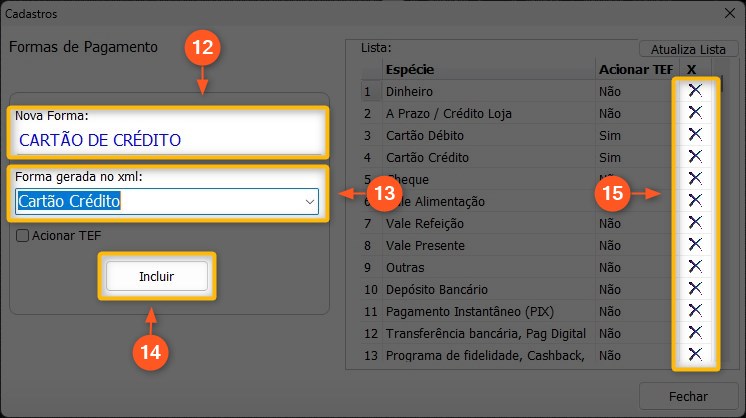 15 – Caso precise remover alguma forma de pagamento, clique no X no final do campo da forma de pagamento que deseja apagar.