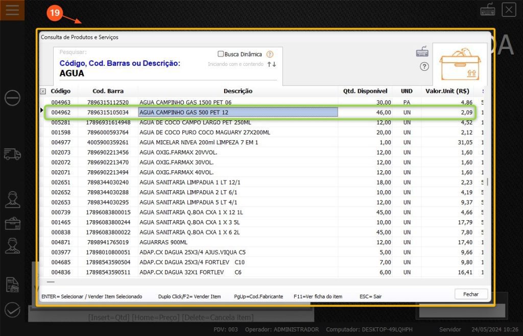 19 – Apenas comece a digitar o nome do produto que será vendido e será aberto uma tela com a lista de produtos, basta selecionar o correto.
