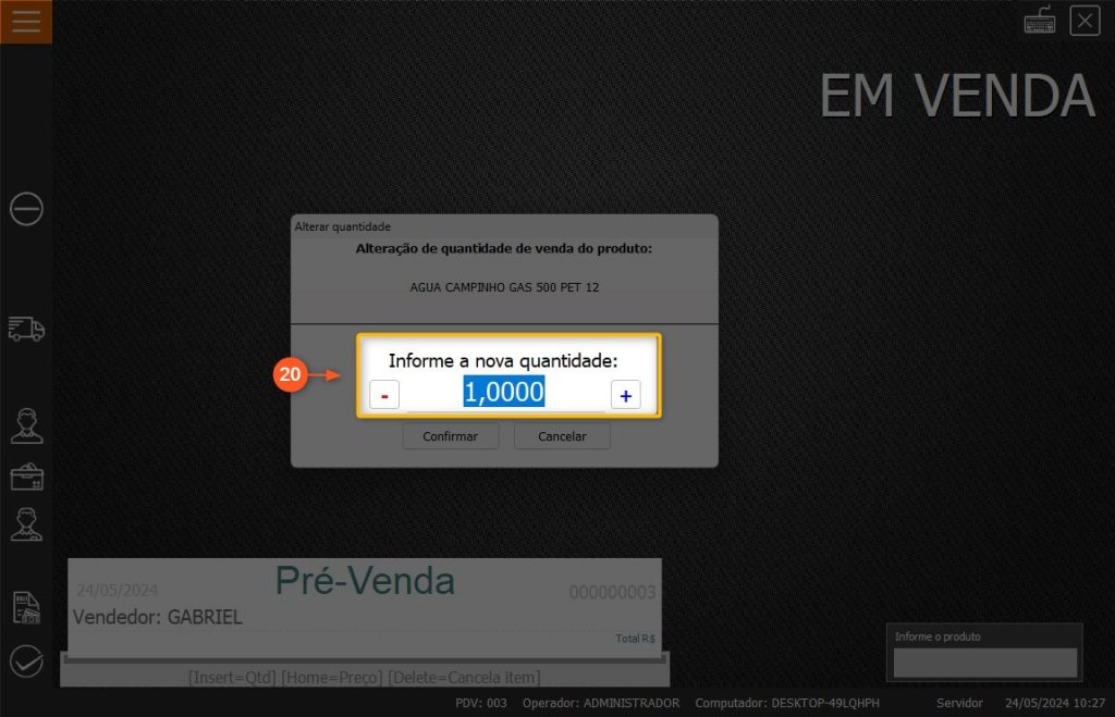 20 – Informe a QUANTIDADE, caso esteja configurado para solicitar a quantidade após selecionar o produto.