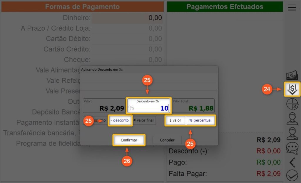 25 – Clique em DESCONTO e defina se será descontado um valor em R$ (REAIS) ou % (PORCENTAGEM). Após isso insira o valor no campo DESCONTO EM…