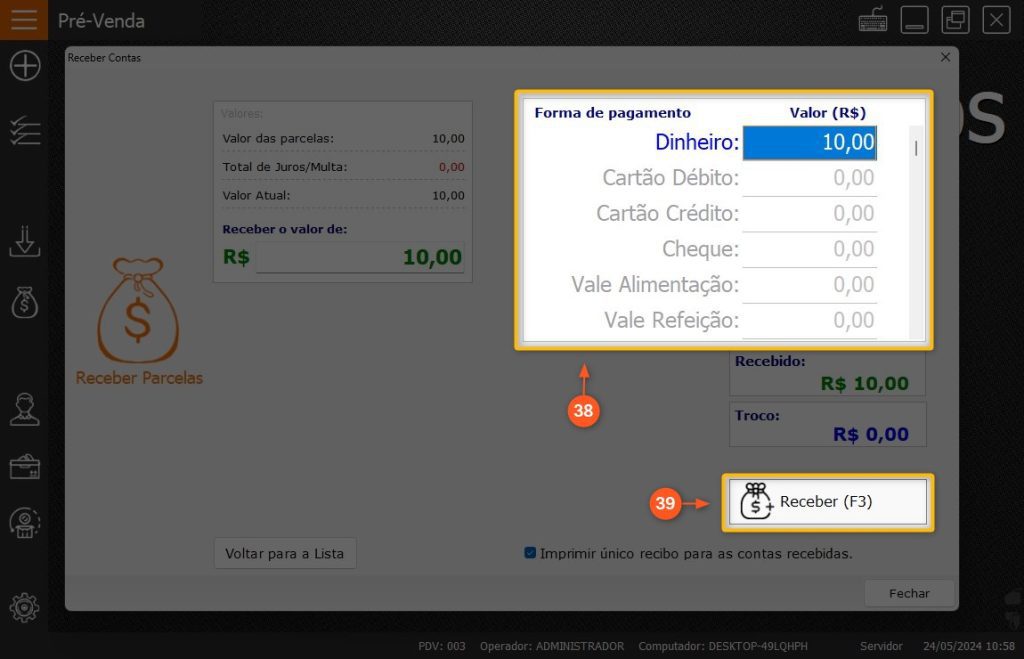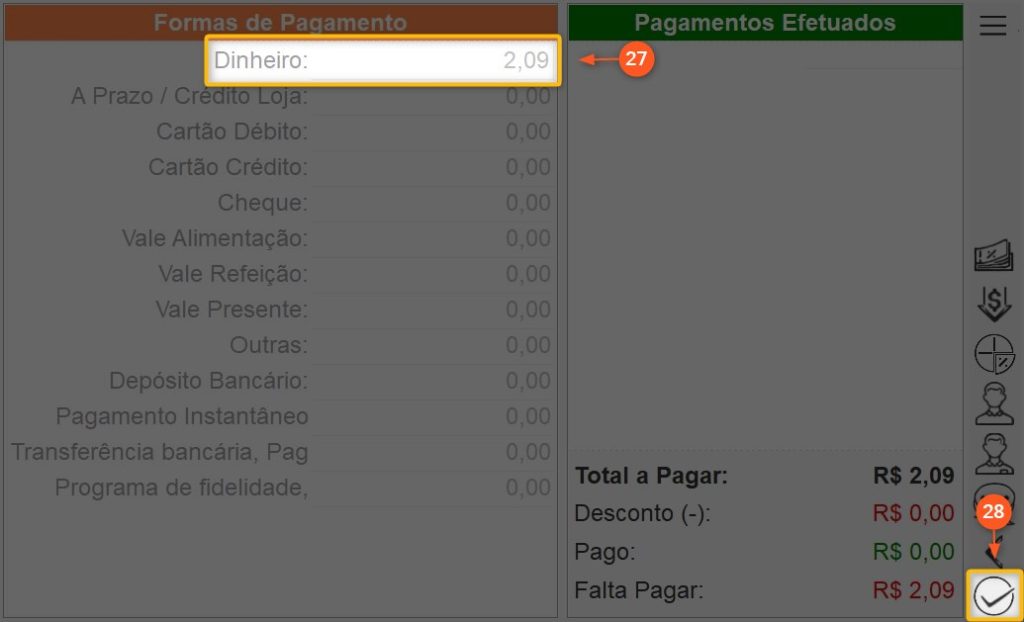 27 – Insira o valor pago pelo cliente na forma de pagamento utilizada por ele e aperte a tecla ENTER do seu teclado.