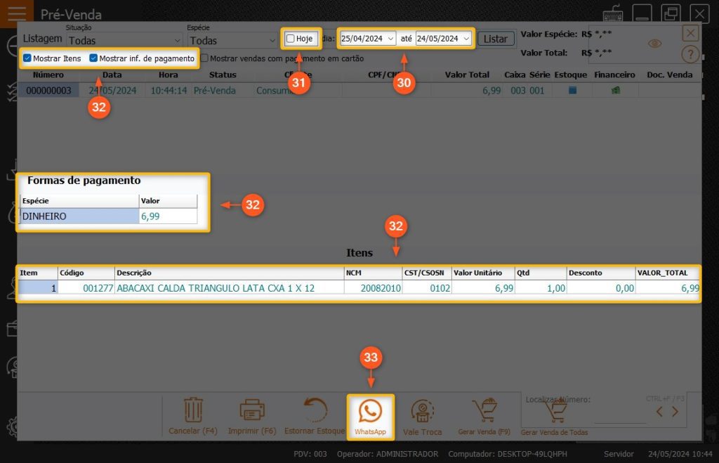 33 – Caso queira enviar a PRÉ-VENDA por WHATSAPP basta selecionar ela e clicar em WHATSAPP no menu inferior.
