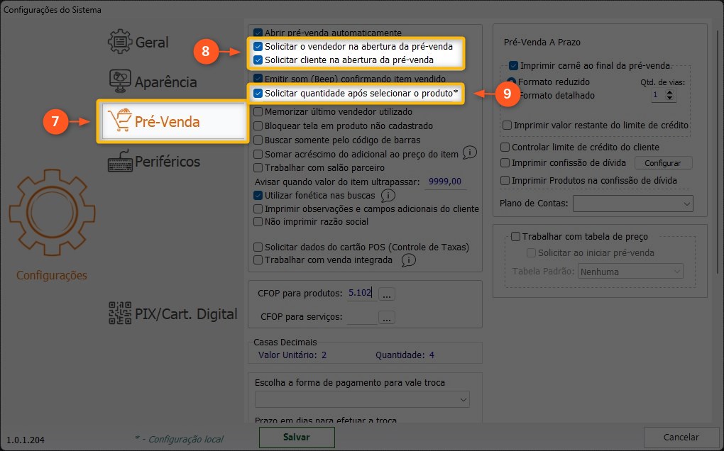 8 – Defina se você quer SOLICITAR O VENDEDOR OU CLIENTE NA ABERTURA DA PRÉ-VENDA.