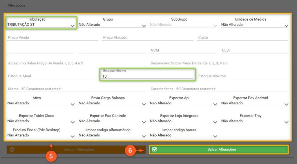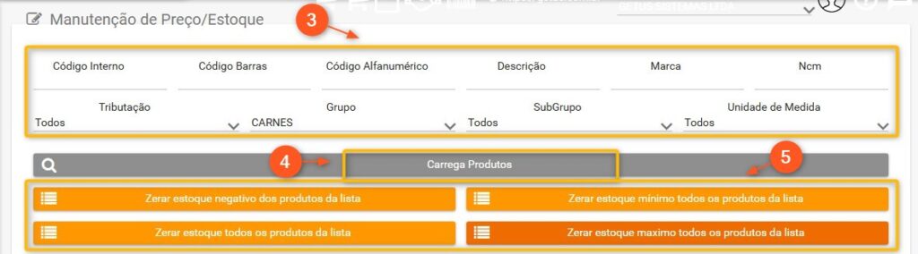 7 – Existem diversos filtros que podem ser utilizados para encontrar os produtos que você precisa alterar, basta analisar qual filtro será melhor de acordo com cada situação. Caso queira que retorne todos os produtos do estoque, basta deixar os filtros vazios.