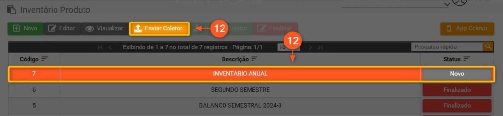 12 – Selecione o INVENTÁRIO que criou e clique em ENVIAR COLETOR.