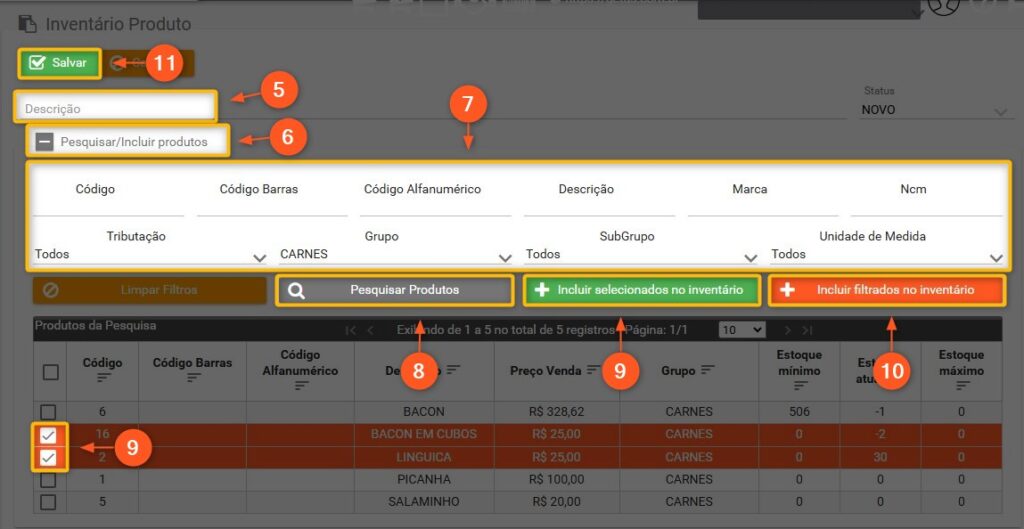 10 – Outra opção é clicar em INCLUIR FILTRADOS NO INVENTÁRIO, dessa forma, todos os produtos da lista serão adicionados ao inventário.